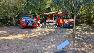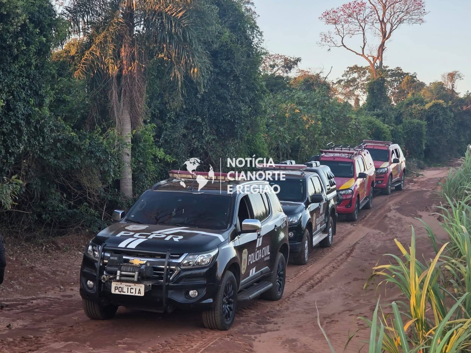 Equipe 2 – guarnição de busca com cão, composta por 3 militares e o cão de busca, tendo deslocado até a propriedade rural da última localização sabida das vítimas (Distrito de Vila Rica), em conjunto com a PCPR para averiguar área de mata nos fundos da residência. Utilizado drone para visualização de possíveis pontos de interesse e utilizado o cão na área do pesqueiro.