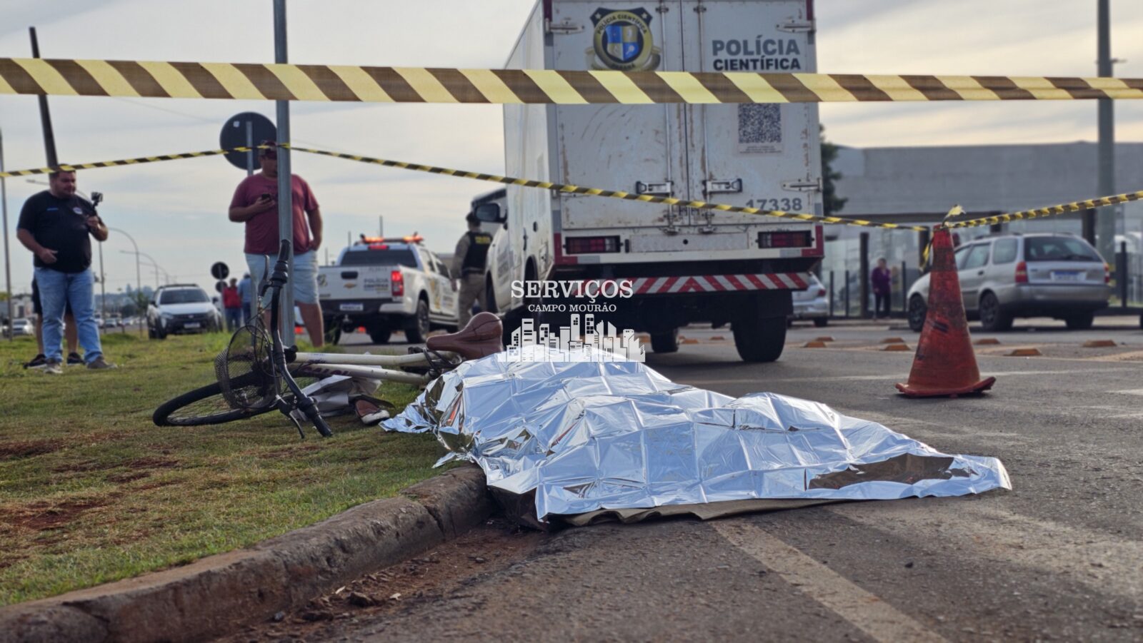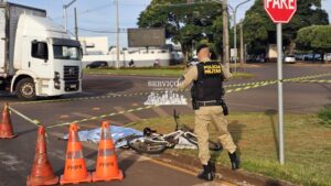 Uma idosa de 71 anos morreu na manhã desta segunda-feira (26) após ser atropelada por uma carreta em um cruzamento de Campo Mourão. Imagens de câmeras de segurança registraram o momento em que a vítima perde o controle da bicicleta e cai exatamente no momento em que o veículo pesado passava pelo local. A carreta acabou passando por cima da mulher, que não resistiu aos ferimentos.