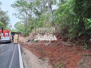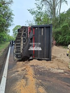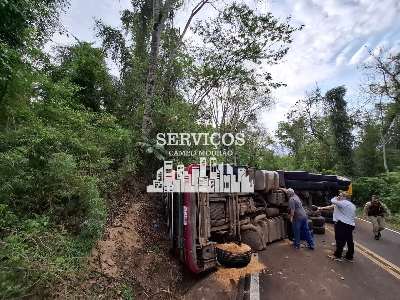 Segundo informações, o veículo, carregado com areia, seguia sentido Terra Boa quando o condutor perdeu o controle da direção, colidiu contra um barranco e, em seguida, tombou sobre a pista.