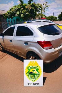 Um Chevrolet Onix prata, com alerta de furto/roubo, foi recuperado pela Polícia Militar na manhã desta quinta-feira (30) em um trecho da PR-465, rodovia que liga os municípios de Araruna e Peabiru.
